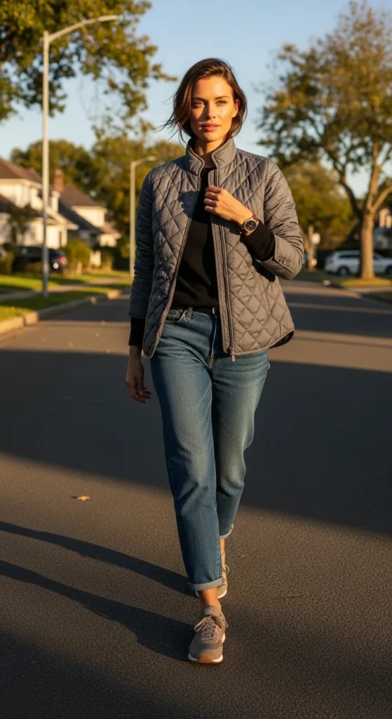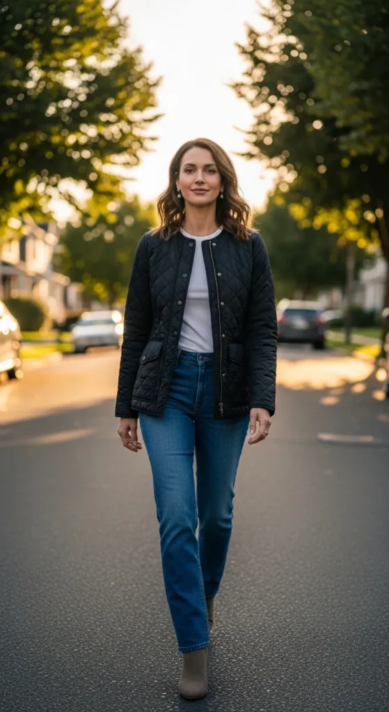A classic quilted jacket over a fitted tee and straight jeans delivers reliable comfort with a clean silhouette, perfect for everyday moments that call for warmth without overthinking.