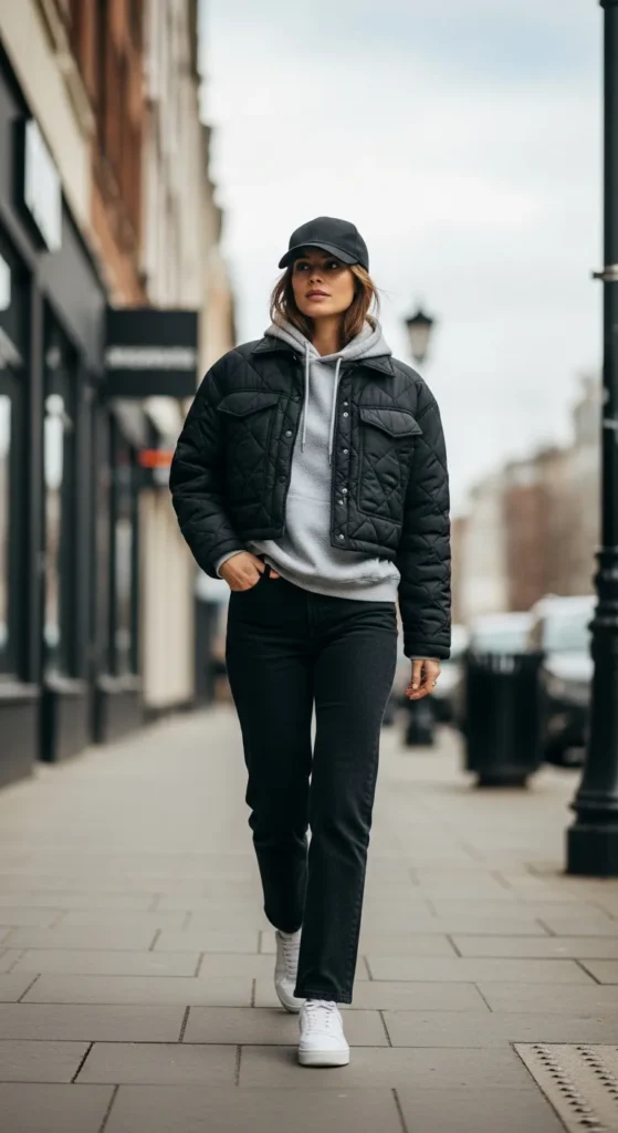 A short black quilted jacket over a gray sweatshirt and straight black jeans delivers a clean, modern look that feels cozy without trying too hard, perfect for busy days on the go.