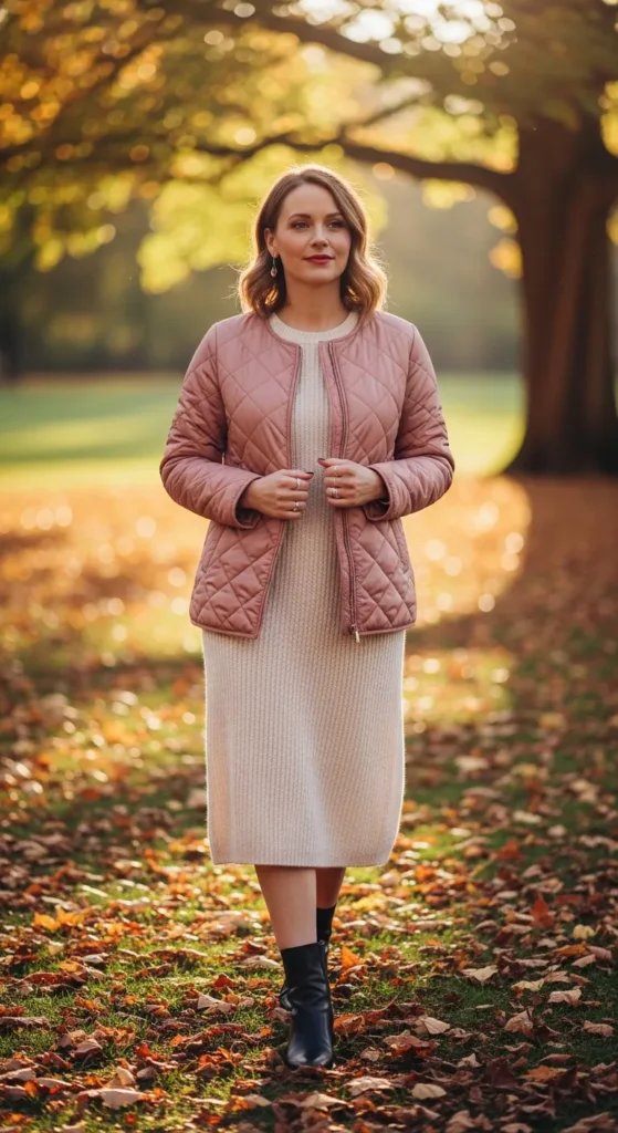 A blush quilted jacket paired with a cream knit dress creates a warm, feminine outfit that feels gentle and cozy, perfect for cooler days when you still want softness and movement.
