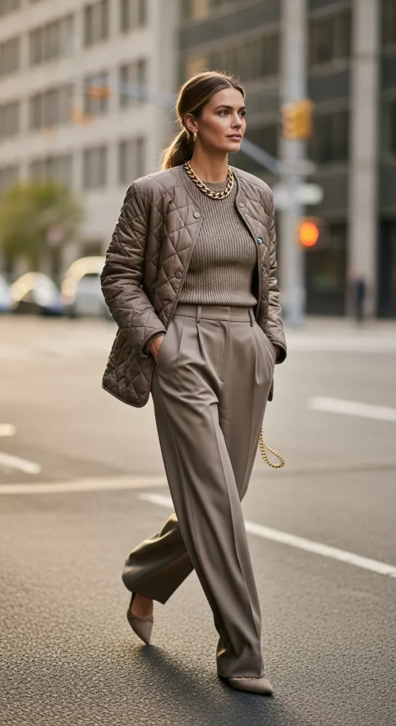 A taupe quilted jacket layered over a fitted knit top and wide leg trousers creates a cozy yet refined silhouette that feels warm, breathable, and quietly stylish for everyday routines.