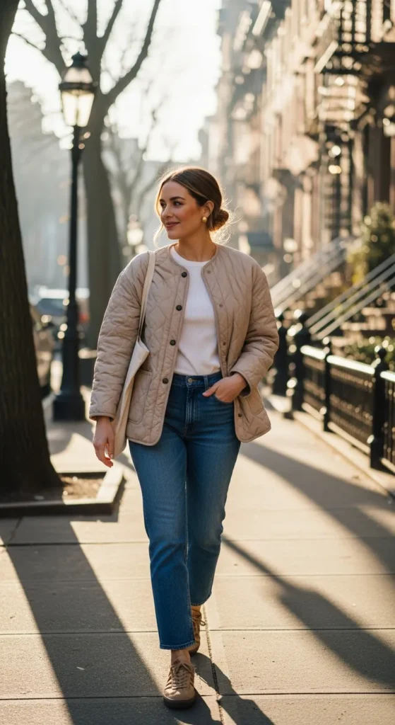 A beige quilted jacket layered over a ribbed white tee and straight leg blue jeans creates an easy, comforting outfit that feels calm, put together, and perfect for slow mornings and everyday city errands.