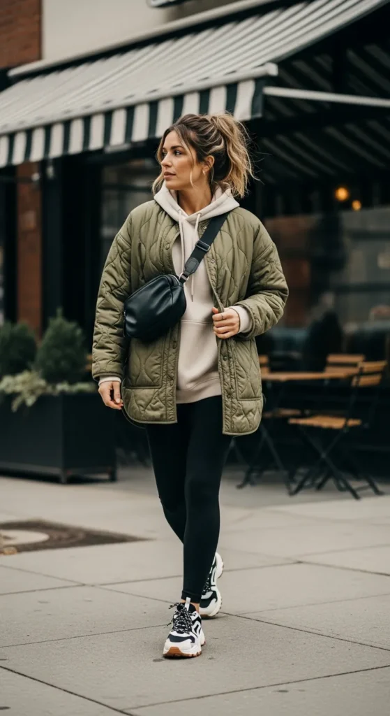 A lightweight olive quilted jacket paired with a cream hoodie and black leggings feels cozy and intentional, perfect for slow coffee walks when you want comfort but still look effortlessly styled.