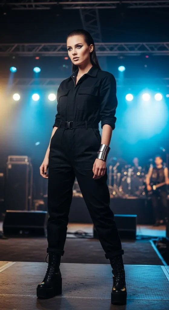 A black jumpsuit with utility pockets feels modern, strong, and effortlessly cool. It’s a one-piece solution that still delivers that tough rocker attitude without overthinking layers.