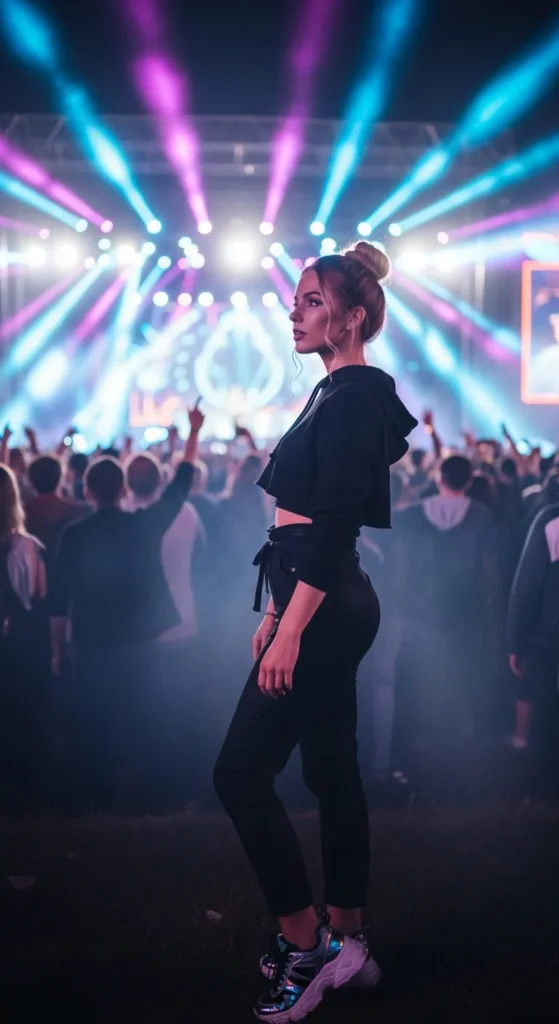 A cropped hoodie paired with structured high-waist pants balances comfort and confidence. It’s relaxed enough for standing all night but sharp enough to stand out.
