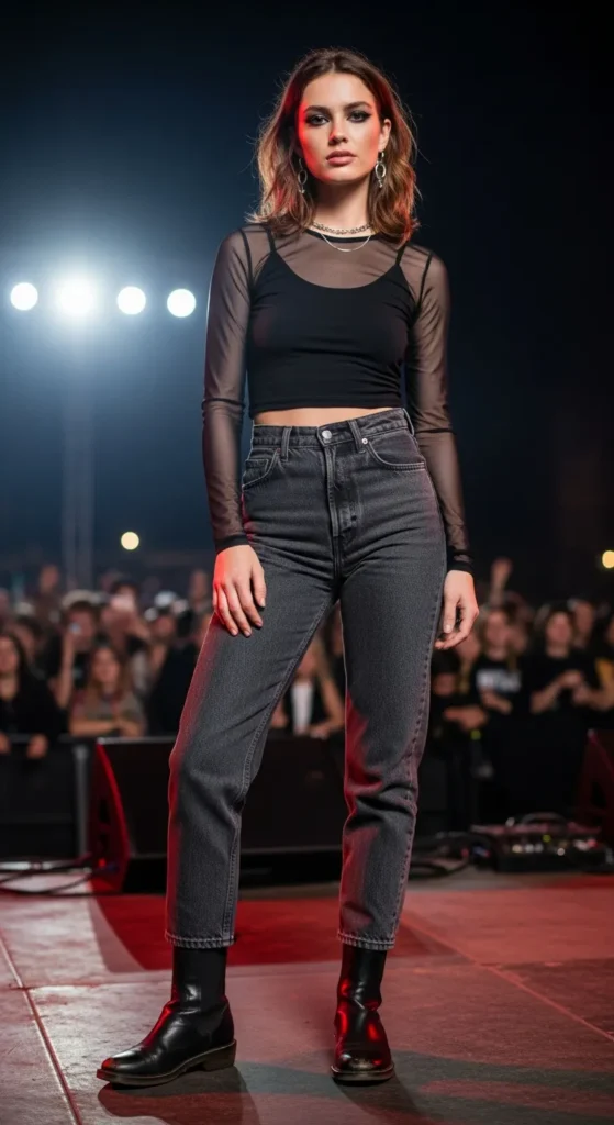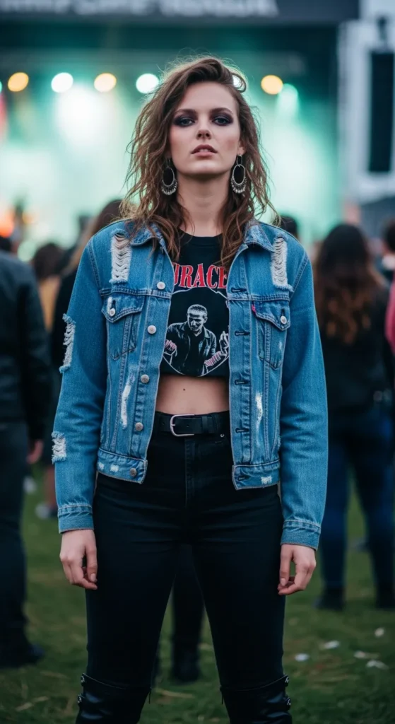 A worn-in denim jacket layered over a cropped band tee and high-rise black jeans feels rebellious yet familiar. It’s casual, confident, and perfect for singing along without worrying about comfort or movement.