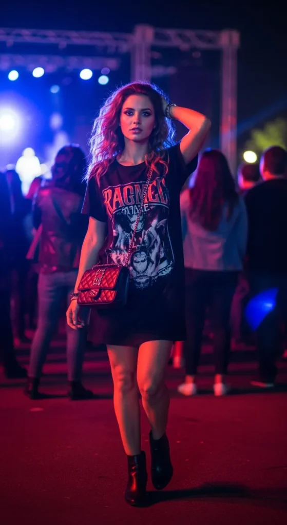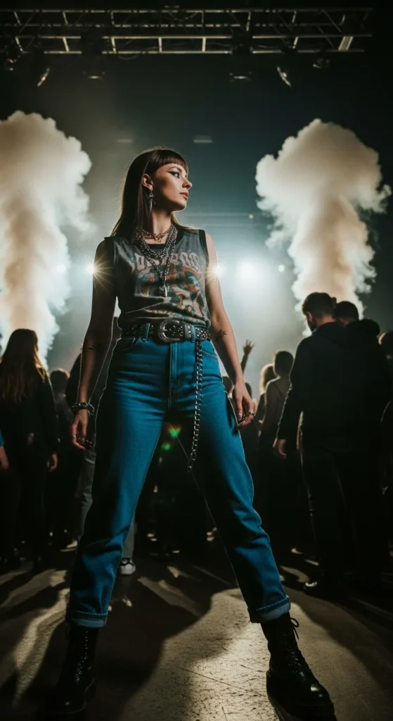 Stylist Suggestion: Add a chain belt and finger rings. These details elevate the casual base and give the outfit a gritty, concert-ready feel.