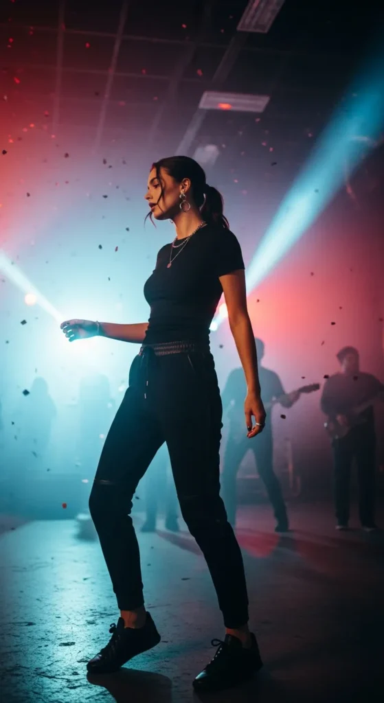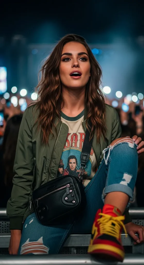 Stylist Suggestion: Choose bold sneakers and a high bun. The sporty touches keep the look grounded while still matching the concert’s high-energy atmosphere.
