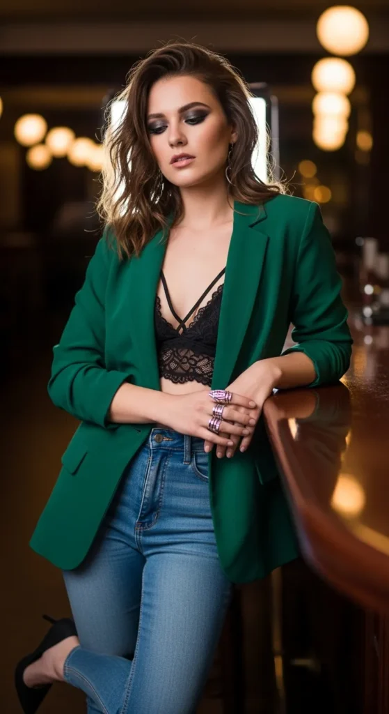 An emerald blazer layered over a black lace bralette with high-waisted skinny jeans combines chic tailoring with casual vibes. Perfect for a stylish bar look that’s both playful and sophisticated.