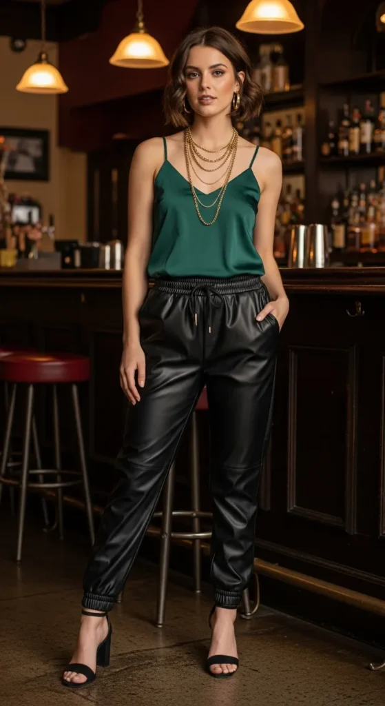 Pairing a silky emerald camisole with faux leather joggers fuses comfort with party-ready style. It’s perfect for a relaxed bar night with a chic edge.