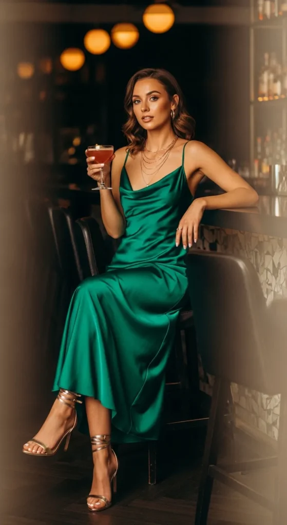 A flowing emerald satin slip dress catches the bar lights beautifully, pairing elegance with a playful nod to Saint Patrick’s Day. Its soft sheen and fluid cut create movement while keeping the vibe sophisticated.