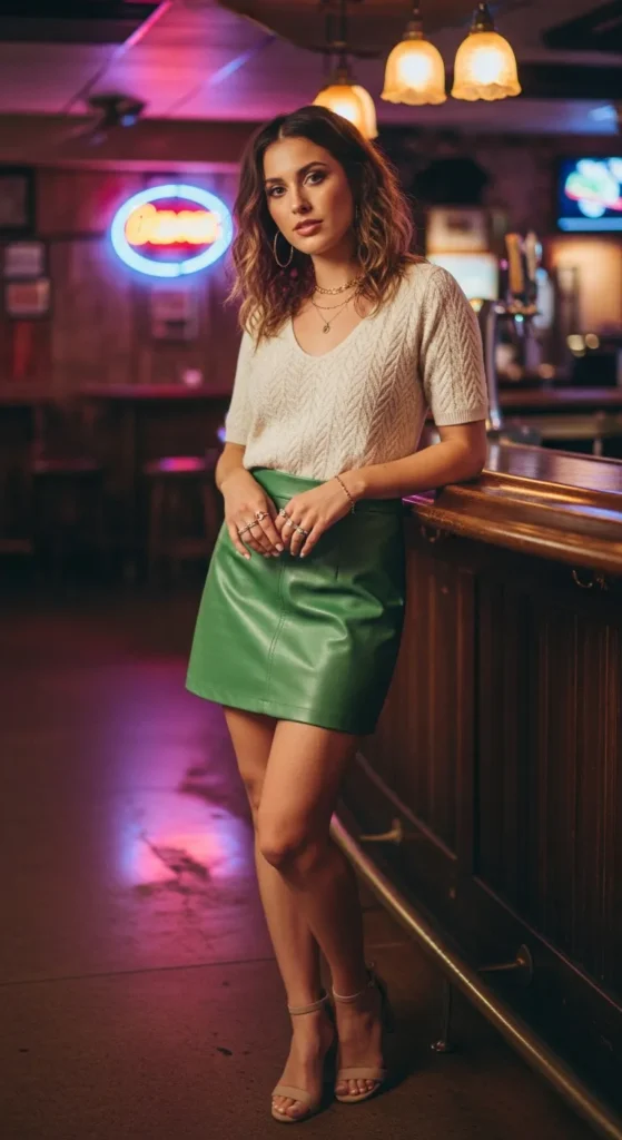 A high-shine green leather skirt paired with a soft knit top balances edgy and cozy elements, making it versatile for festive nights at the bar.