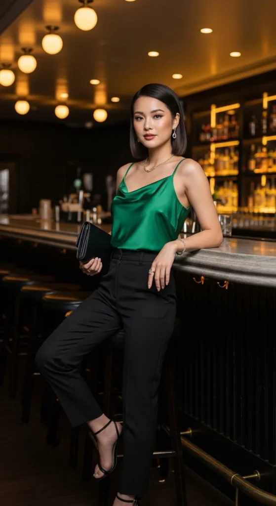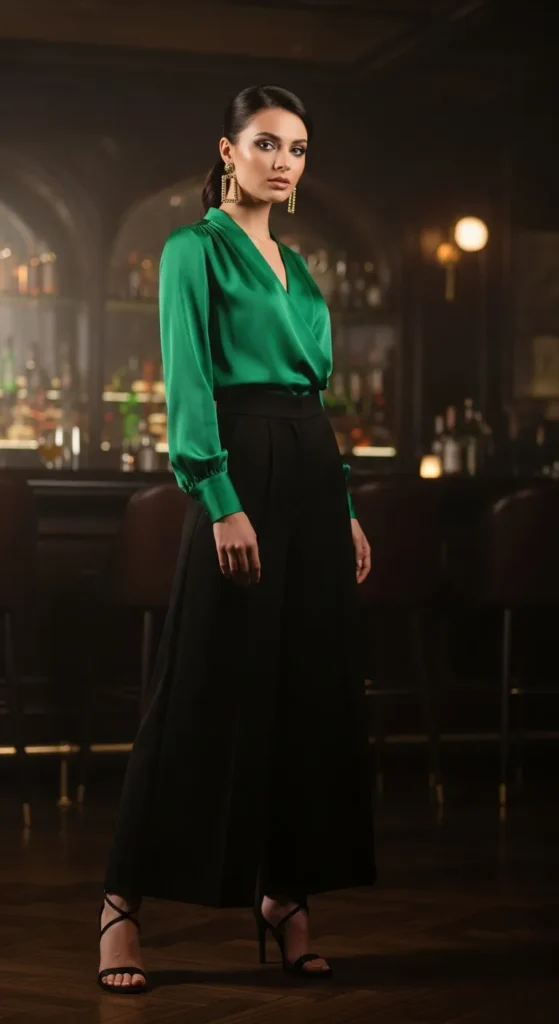 A flowing green satin blouse tucked into wide-leg black pants delivers movement and chic elegance, ideal for relaxed yet stylish bar nights.