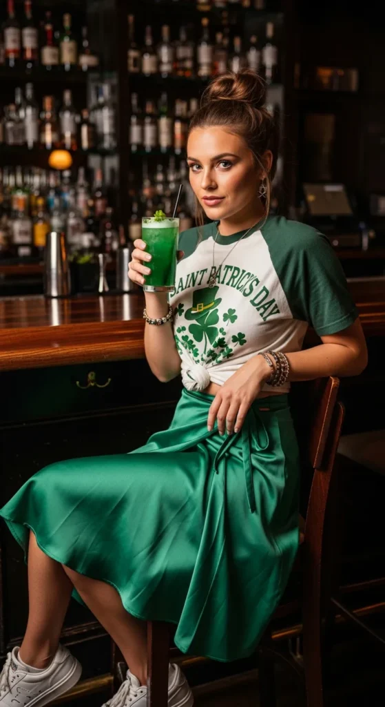 A green satin wrap skirt with a quirky Saint Patrick’s themed graphic tee balances playful charm and sophistication. Tuck in the tee slightly for a flirty, carefree bar-ready vibe.