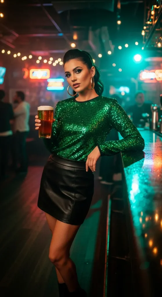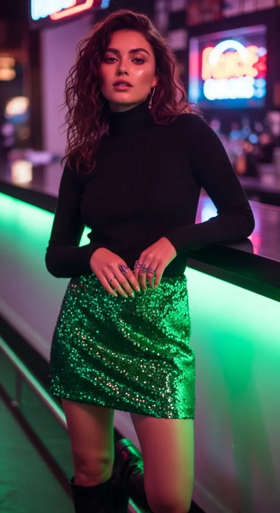 A green sequin mini skirt paired with a fitted black turtleneck balances sparkle and sophistication. Perfect for a chic Saint Patrick’s Day bar look.