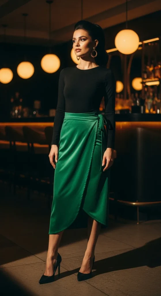 A green velvet wrap skirt paired with a fitted black bodysuit combines soft textures and figure-flattering lines, ideal for a stylish bar night.
