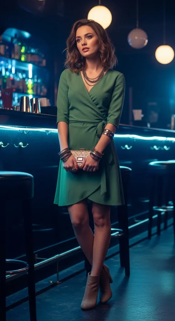 A classic green wrap dress with neutral ankle boots creates effortless elegance with playful bar-party vibes. The wrap accentuates curves while remaining comfortable for dancing.