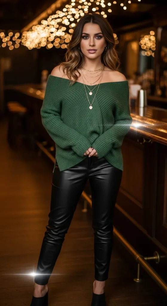 7. Off-Shoulder Green Knit Sweater with Leather Pants