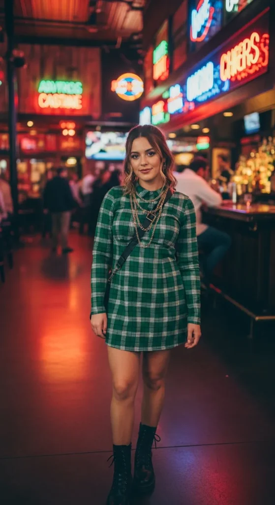 A plaid green mini dress brings playful vibes, perfect for Saint Patrick’s Day energy. Combat boots add an edgy twist to a classic festive look.