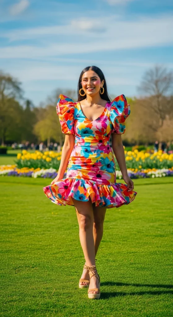 Stylist Suggestion: Wear hoop earrings to match the lively dress, they catch light and add bounce to your steps.