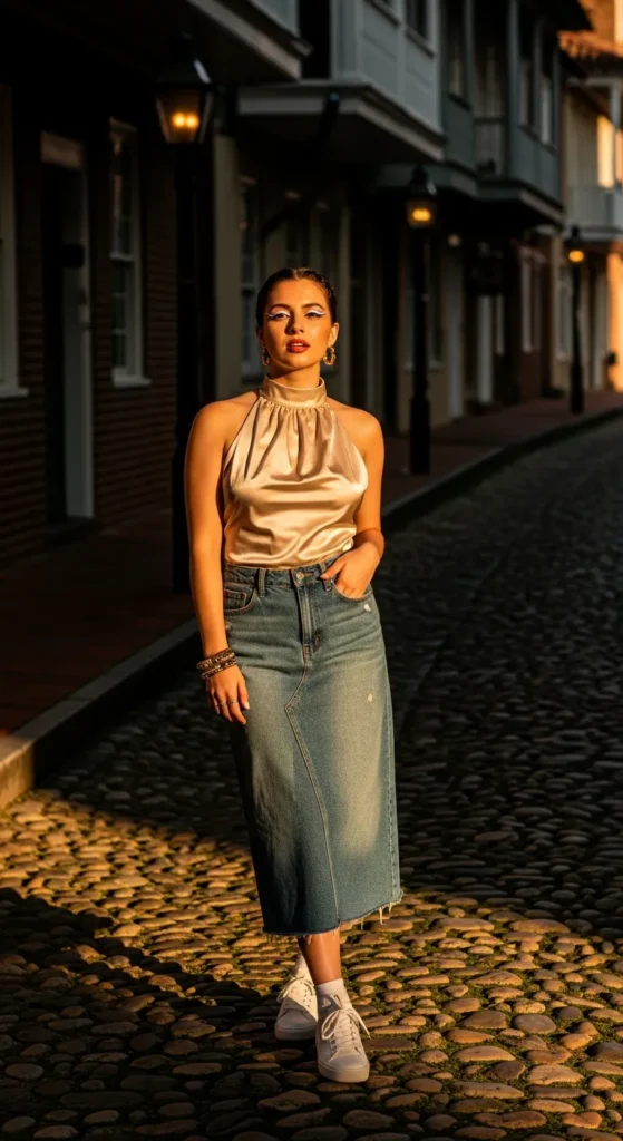 Champagne satin halter with a faded denim skirt blends elegance with street style, perfect for sunny explorations then rooftop sips.