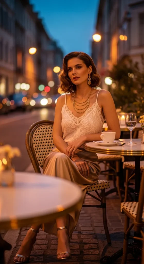 Champagne satin slip skirts glide with elegance next to a delicate lace tank, easy day‑to‑night transition for art galleries then cocktails.