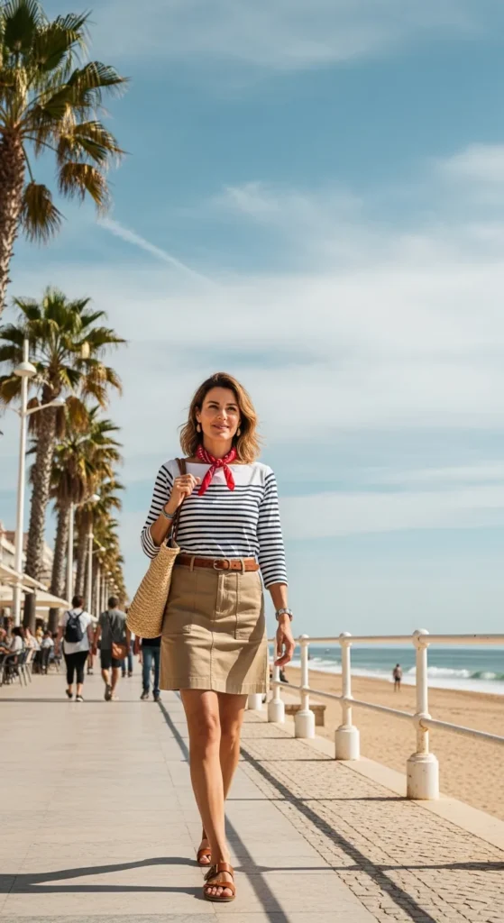 Classic navy stripes and a khaki skort feel timeless by the seaside promenade. Functional and chic with easy layers.