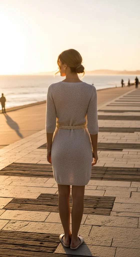 Light knit dress with a braided belt for subtle definition, easy going yet pulled‑together for seaside plazas.