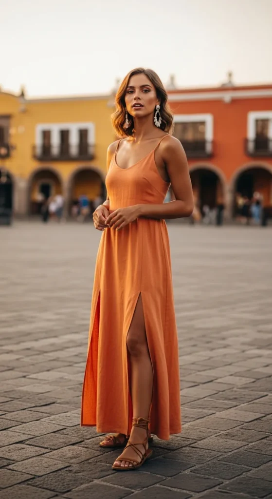 Soft apricot linen sways with every step through Plaza de Armas. The airy silhouette keeps you cool under the golden light, while subtle side slits let your toes wiggle in strappy sandals.