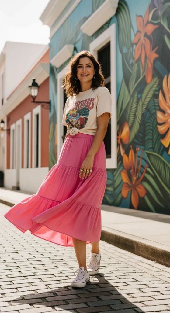 Playful pink tiers meet a vintage‑style graphic tee for an artsy street look. Twirl through alleyways with a youthful mix of edge and charm.