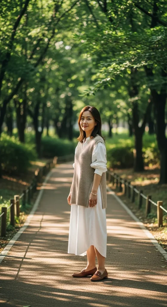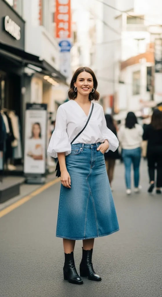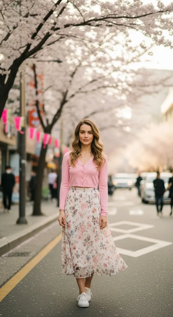 A soft pastel cropped knit paired with a flowy midi skirt gives you that feminine Seoul spring vibe with structure and comfort in every step. It’s airy yet chic, perfect for street cafes.