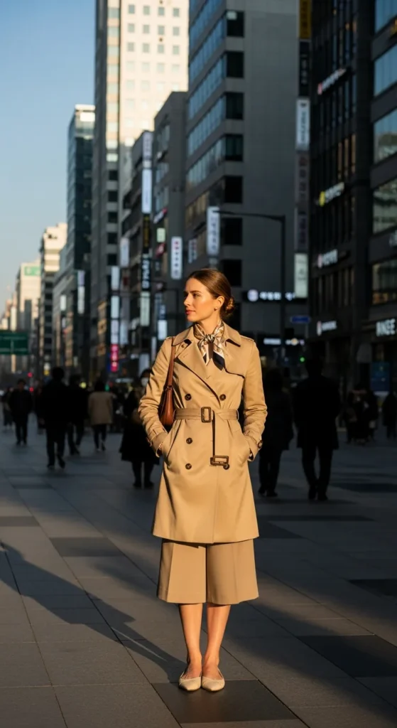 A belted trench layered over culottes feels tailored yet free. This modern silhouette works when you want structure without stiffness.