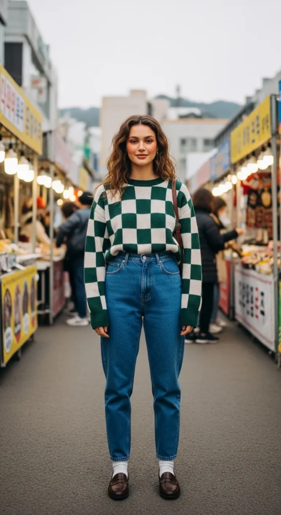 Bold pattern meets relaxed denim for an outfit that’s easygoing yet sharp. The checker knit grounds your look with classic Seoul energy.
