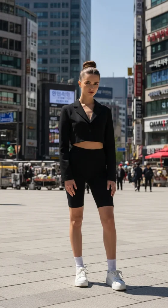 Sporty sophistication shines in a cropped blazer teamed with cycling shorts. Unexpected yet polished for city strolls.