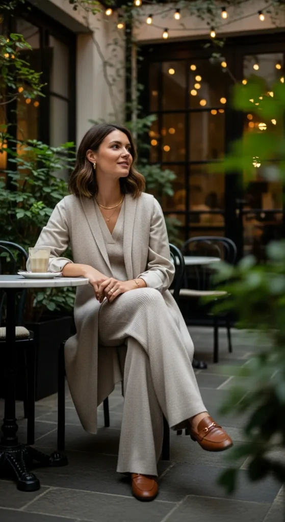 Matching knit sets paired with a longline vest feels intentional and luxe, perfect for strolls in crisp weather.