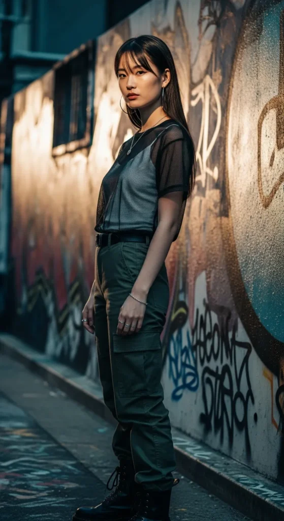 Textural play makes this edgy layer combo standout. The mesh tee adds interest while cargo pants keep it casual and functional.