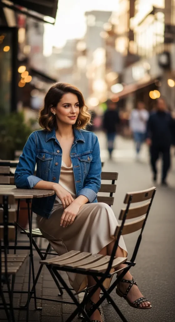 Silky elegance meets everyday cool with a satin slip dress layered under a relaxed denim jacket. Feminine texture with grounded outerwear creates depth and contrast.