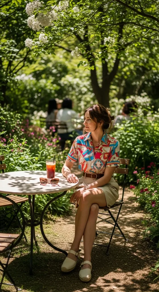 A scarf-print blouse with tailored shorts is polished and playful at once a standout for summer events.
