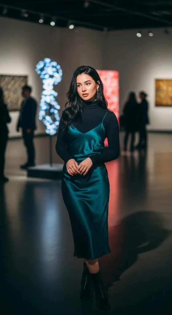 Layering a fitted turtleneck under a slip dress feels sophisticated yet youthful. Perfect for cooler days.