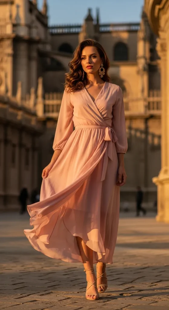 A blush wrap dress flatters every figure while feeling light and flirty. The wrap silhouette moves beautifully in warm breezes, perfect for golden hour near historic Spanish plazas.