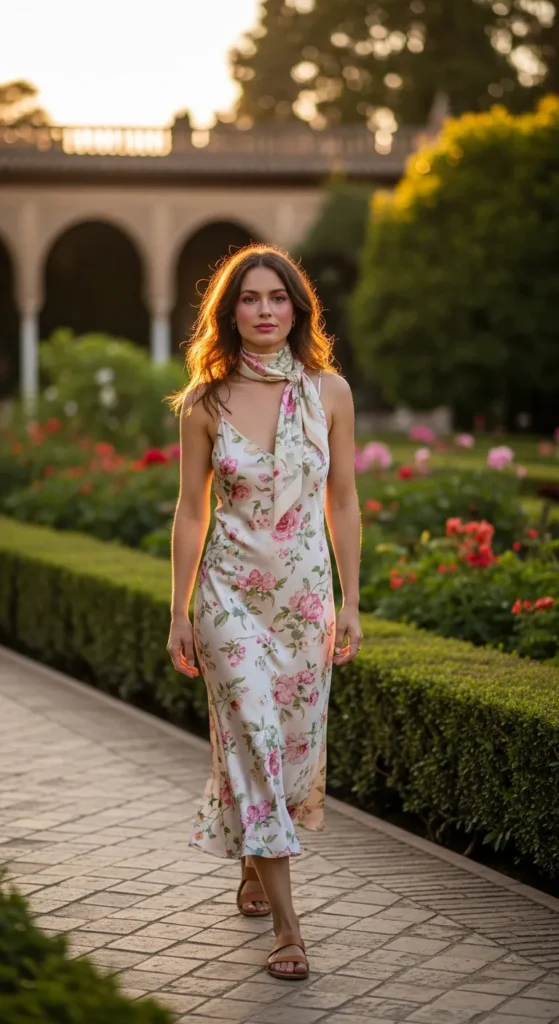 A floral slip dress feels feminine and effortless. Adding a lightweight scarf gives it European charm while offering coverage when needed.