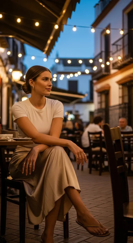 A satin midi skirt paired with a fitted tee blends elegance and ease. It’s ideal for evening tapas when you want comfort but still feel romantic.
