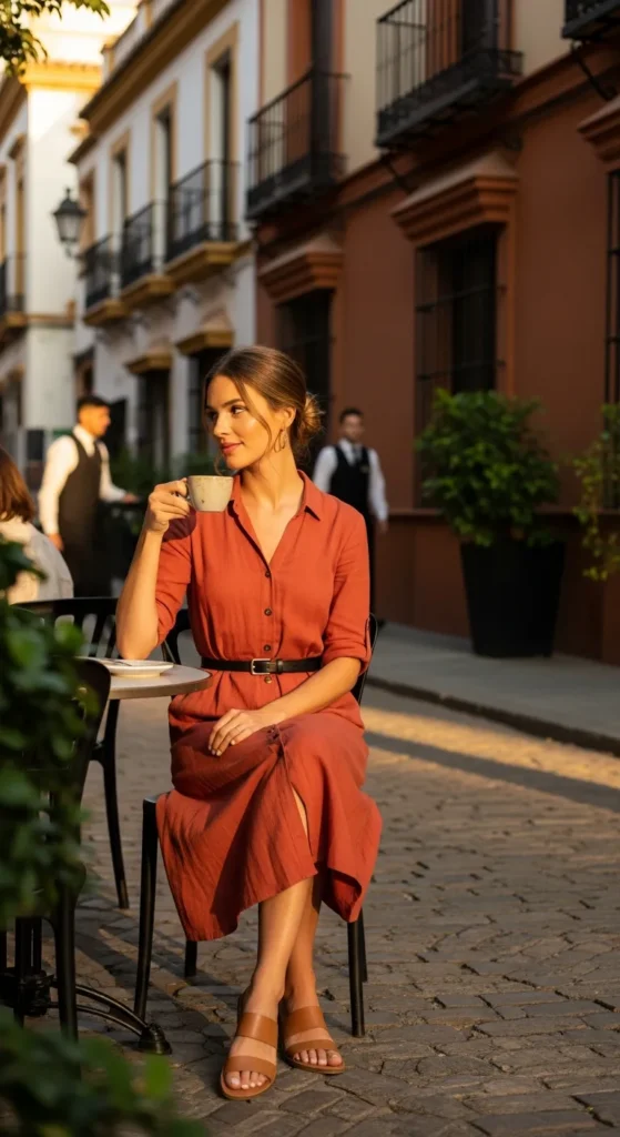 Terracotta tones echo Seville’s architecture. A button-front dress feels tailored yet soft, perfect for café afternoons.