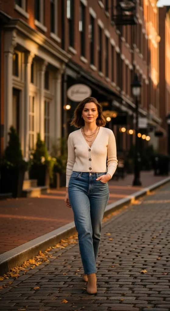 A button cardigan worn as a top with classic jeans creates a simple but stylish everyday outfit.