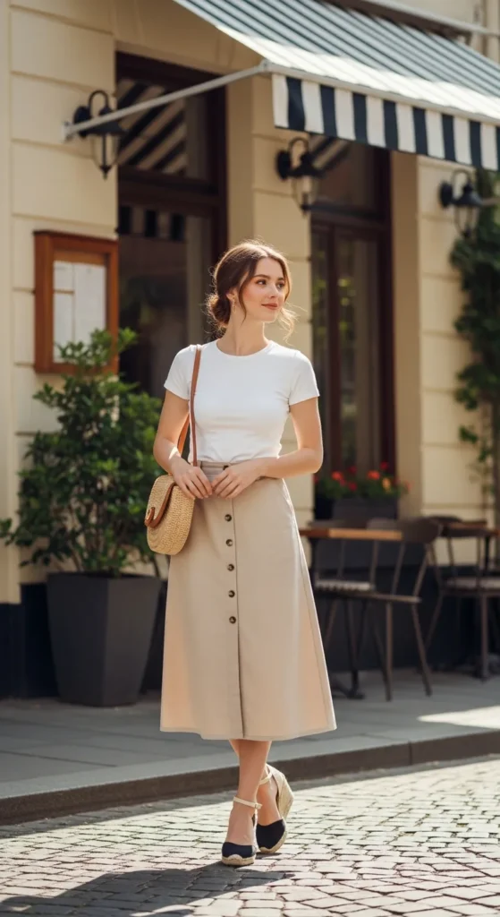 A button-front midi skirt paired with a simple fitted tee creates a polished everyday outfit that feels feminine but relaxed. The vertical buttons add structure while the tee keeps the look casual.
