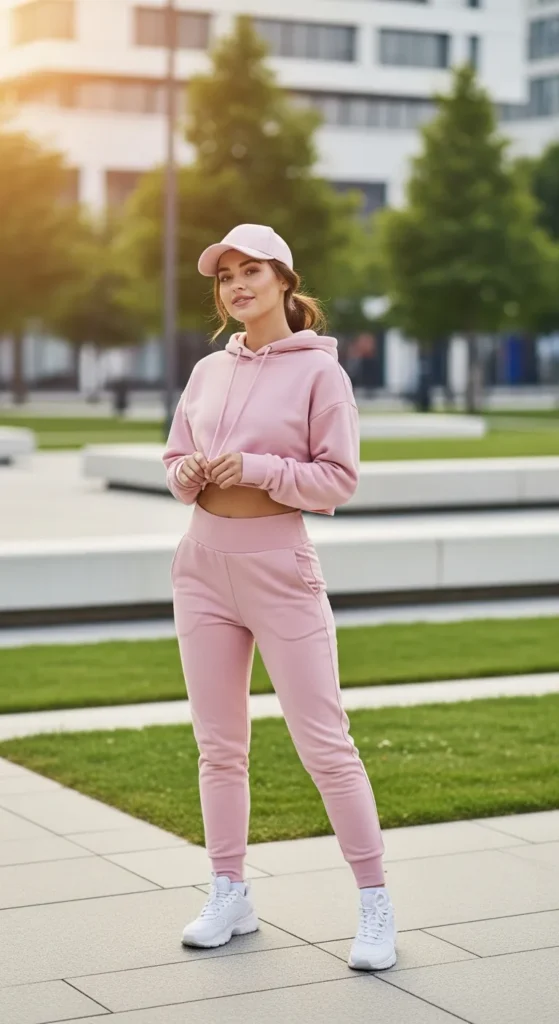 A cropped hoodie matched with high-waisted joggers creates a cozy but trendy athleisure outfit. It’s comfortable enough for lounging yet stylish enough for errands or casual meetups.