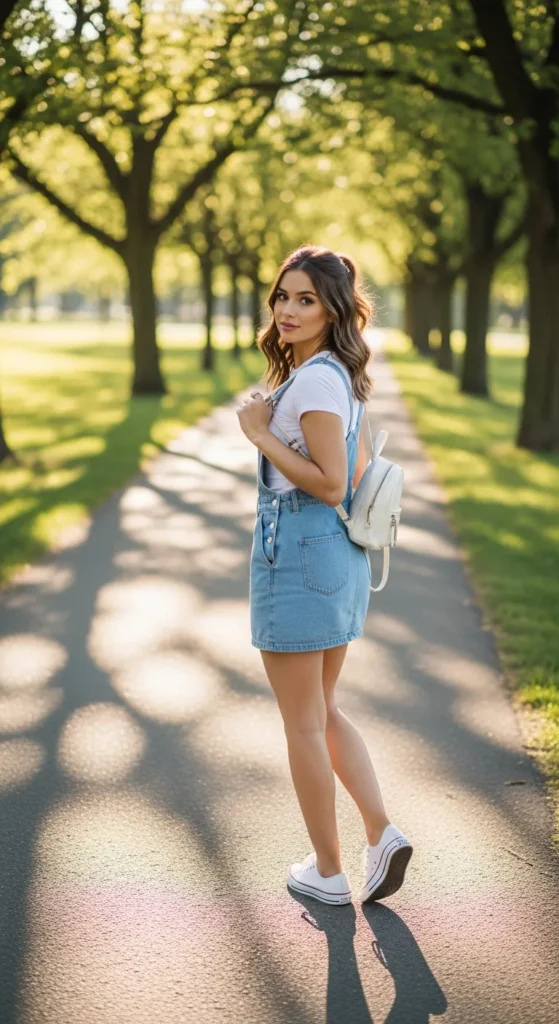 A denim overall dress layered over a basic tee creates a playful, nostalgic outfit perfect for casual days.
