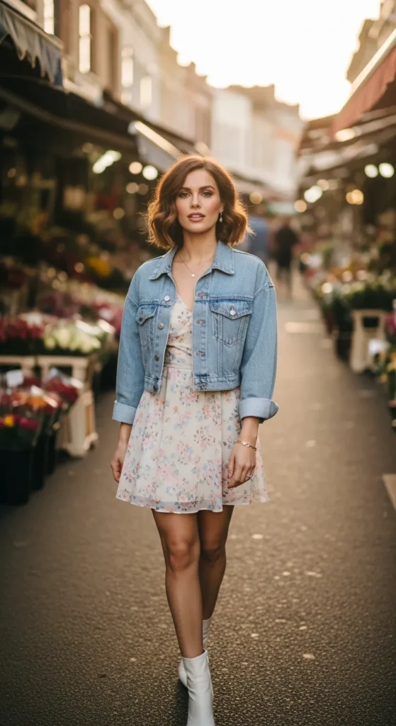 A delicate floral mini dress layered with a classic denim jacket creates the perfect blend of sweet and casual. The light floral print adds softness while the denim jacket makes the outfit wearable for everyday moments.