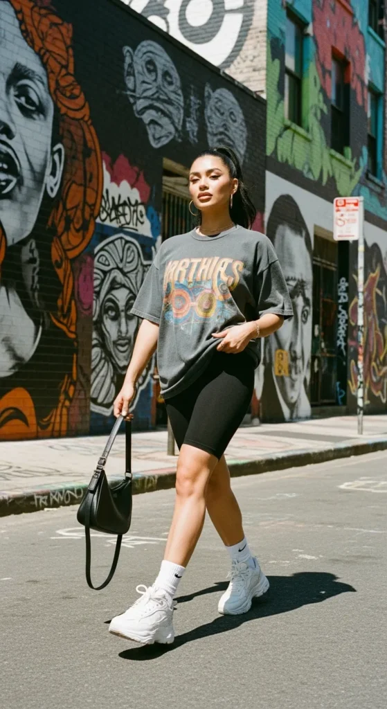 An oversized graphic tee paired with classic biker shorts delivers a trendy off-duty look that feels cool yet comfortable. It’s the kind of outfit you’ll reach for when you want something easy but still Instagram-ready.