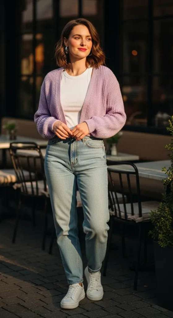 A soft lavender cropped cardigan paired with relaxed light wash jeans creates an effortless outfit that feels gentle and playful. The pastel shade adds charm while the denim keeps things casual, making it perfect for coffee runs or relaxed weekend plans.