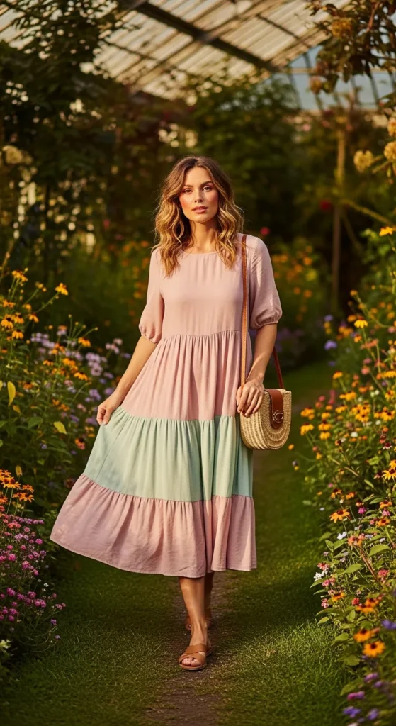 A flowy tiered midi dress styled with simple sandals creates an easygoing outfit that feels romantic and comfortable for warm days.